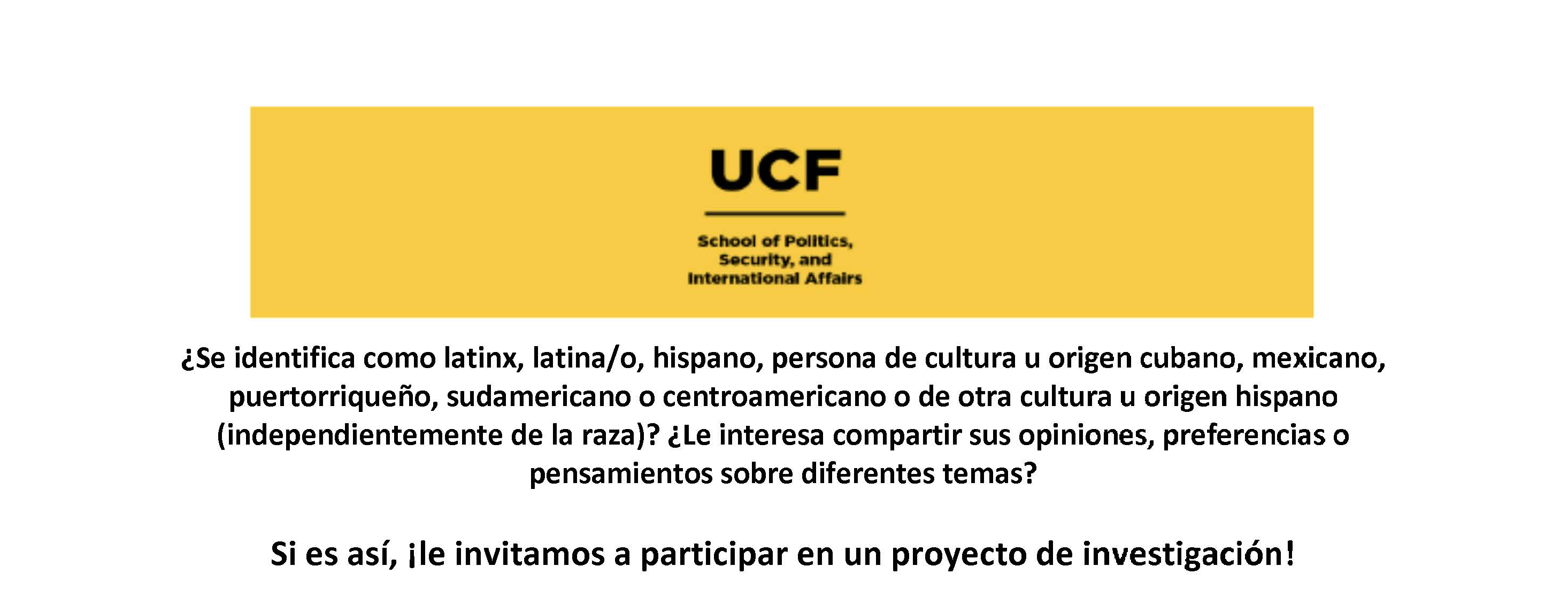 At UCF, I gained further experience as a Graduate Research Assistant while working on a project on political behavior and opinions of Latin Americans living in the United States. To study this matter, we conducted various one-on-one interviews in English or Spanish and held several focus group meetings.